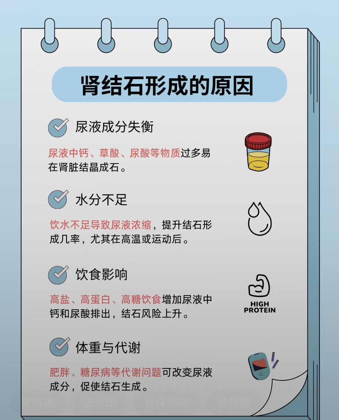 · 后果:尿液浓缩,使得尿液中的矿物质(如钙、草酸、尿酸)浓度过高,更容易结晶、沉淀,形成结石。保证充足的尿量是“冲刷”尿路、防止结晶聚集的最好方法。